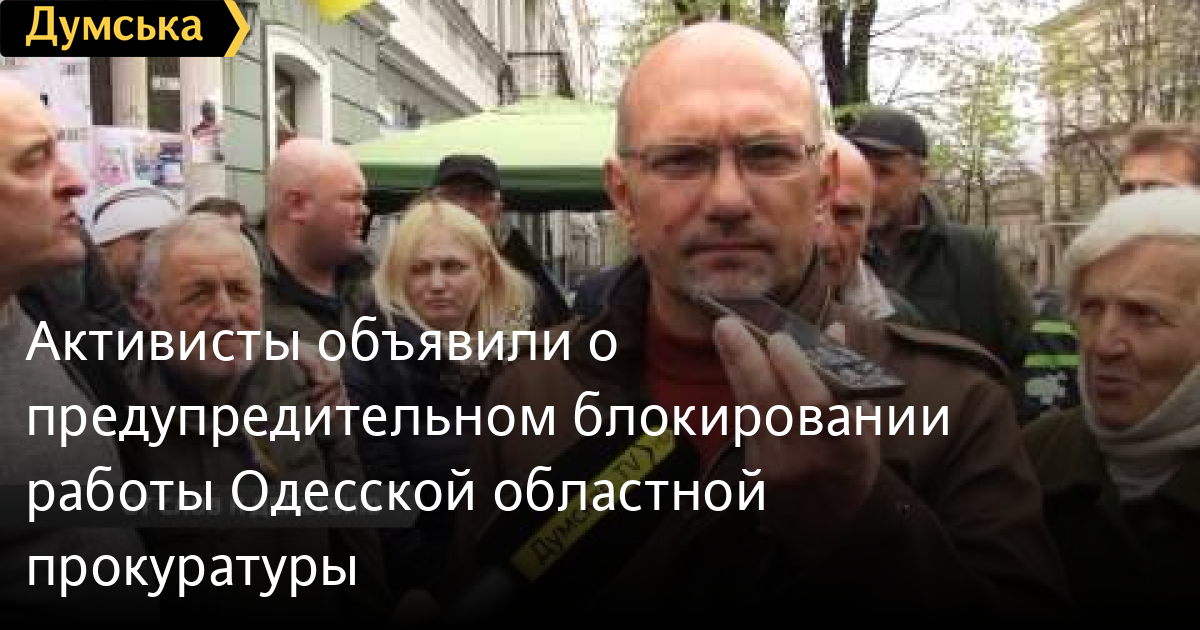 Активисты объявили о предупредительном блокировании работы Одесской областной прокуратурыОт слов к действию. Активисты, протестующие под областной прокуратурой, объявили о предупредительном блокировании работы ведомства. О своем решении общественники уведомили первого заместителя облпрокурора Олега Жученко СМЕРТЬ РОССИЙСКИМ ОККУПАНТАМ! Заметили ошибку? Выделяйте слова с ошибкой и нажимайте control-enter Думская ТВ. Сюжеты: