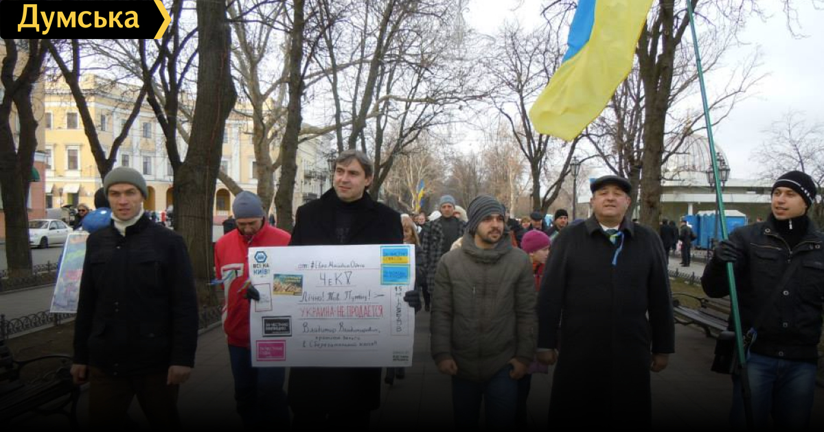 Днем сторонники евроинтеграции собрались около памятника Дюку де Ришелье. Оттуда несколько десятков человек маршем прошли через центр Одессы — от Приморского бульвара до пересечения Пушкинской и Пантелеймоновской, где находится одно из отделений «Сбербанка России», пишет «Откат».
