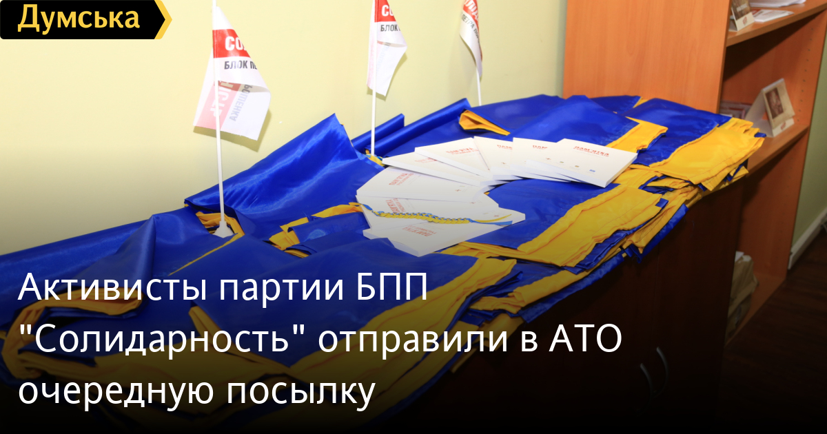 Вчера активисты партии БПП «Солидарность» отправили в зону боевых действий на восток Украины очередную посылку. Военнослужащие получат более сотни украинских флагов и около 500 экземпляров брошюры «Памятка участникам АТО. Права, обязанности и гарантии социальной защиты».