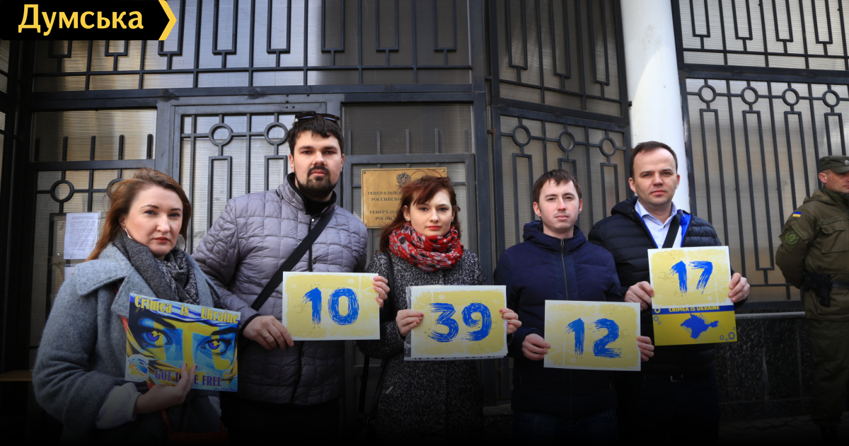 Сегодня, 16 марта, возле Генерального консульства Российской Федерации в Одессе состоялась акция «Крым – это Украина», приуроченная к третьей годовщине оккупации полуострова.