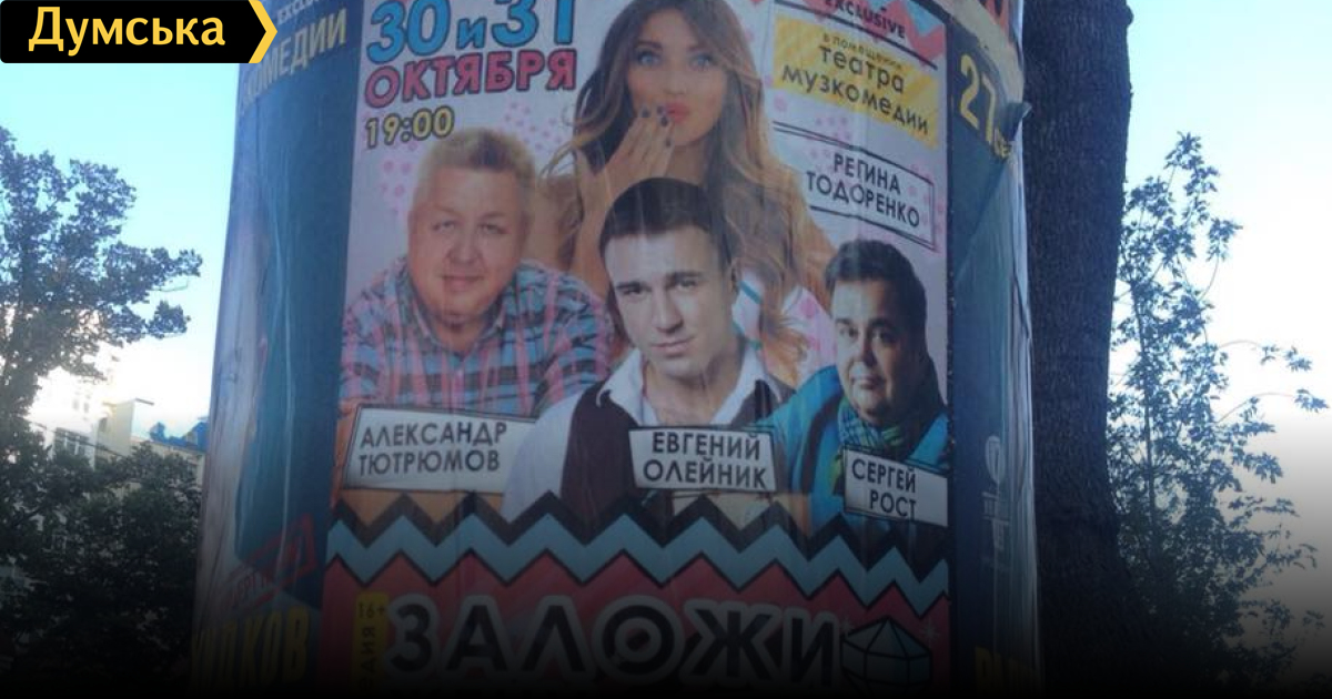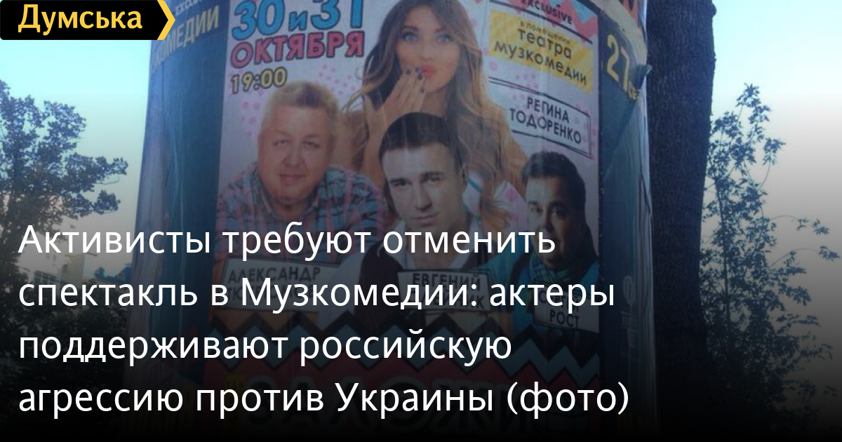 «Изучив персоналии актеров, удалось выяснить ряд интересных фактов о них. Сергей Рост, гражданин РФ. «Майдан» он называет в одном из интервью «опухолью», поддерживает действия «Беркута», аннексию Крыма и размышляет, как Украину можно разделить на три республики Александр Тютрюмов, гражданин РФ. Грубо нарушил украинское законодательство, посетив в июле 2015 через территорию АР Крым Регина Тодоренко, гражданка Украины (?). Ездила на российский песенный конкурс «Голос», где выступала перед гражданами РФ, в т. ч. перед Г. Лепсом, который открыто поддерживает вооруженную агрессию РФ по отношению к Украине Евгений Олейник, гражданин Украины (?). До 2014 года работал в Каменском театре, но с началом войны переехал в Россию, давал интервью в октябре 2015-го на «Сыктывкар-ТВ». Он, как и Регина Тодоренко, в сложные для своей страны времена выбрал сторону оккупантов, убийц и агрессора», — написал Стерненко на своей странице в Facebook.