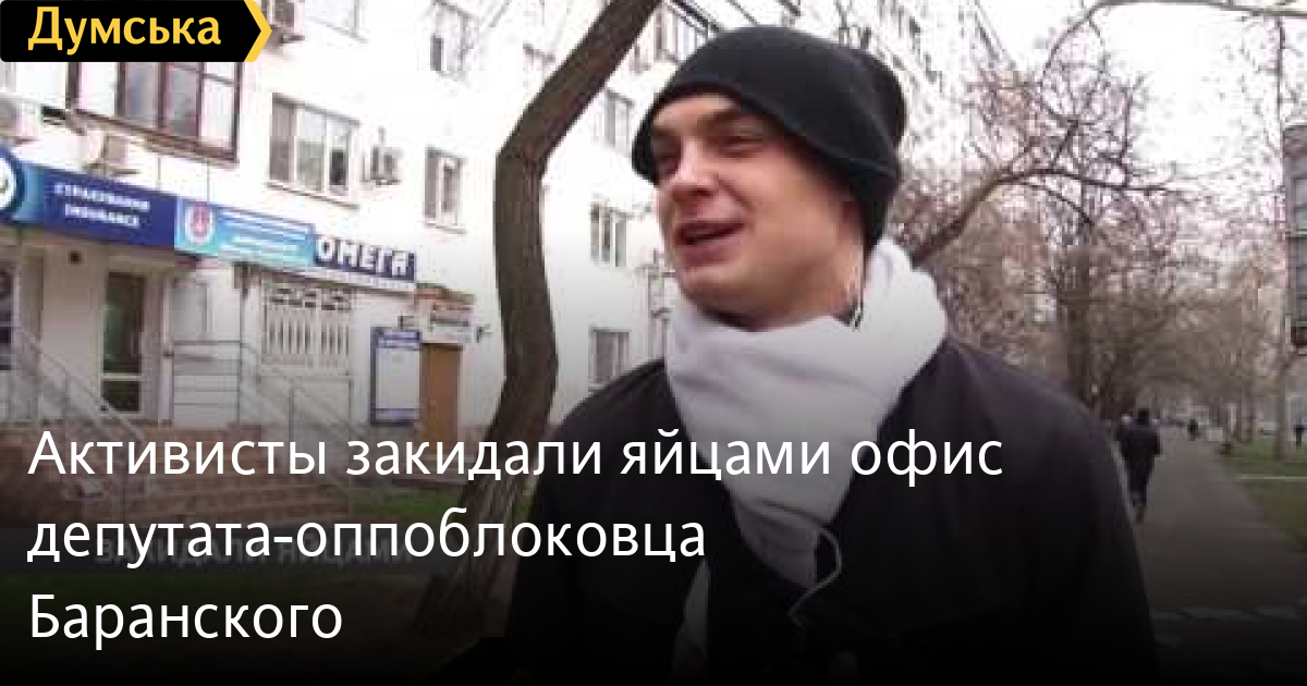 К офису депутата-оппозиционера Виктора Баранского, пришло более десяти активистов. Пришли не с пустыми руками. Выкрикивая лозунги люди забросали яйцами фасад и помещение приёмной. СМЕРТЬ РОССИЙСКИМ ОККУПАНТАМ! Заметили ошибку? Выделяйте слова с ошибкой и нажимайте control-enter Думская ТВ. Сюжеты: