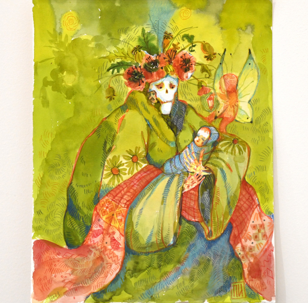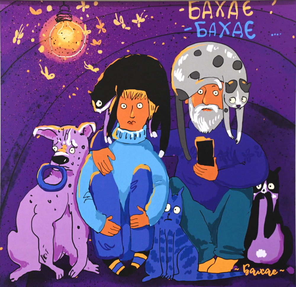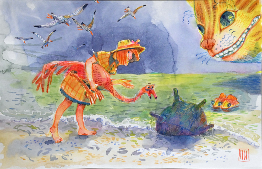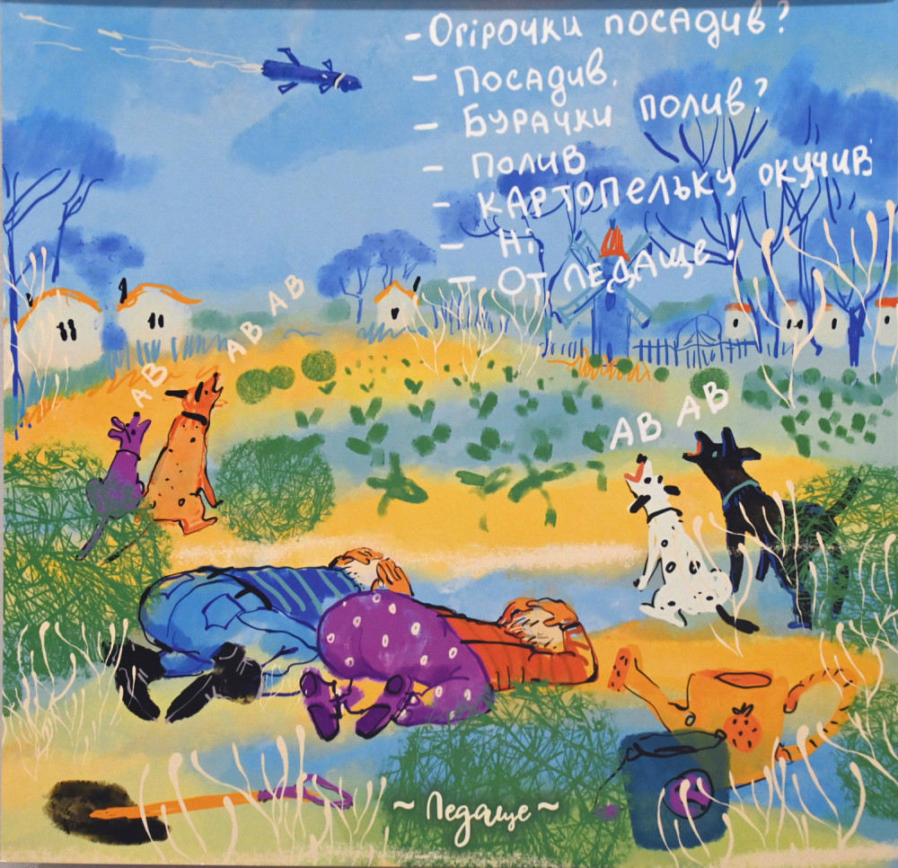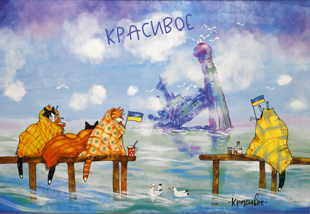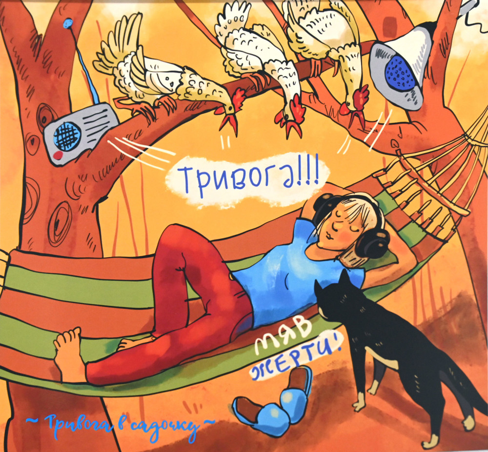 «Я стремлюсь передавать не то чтобы красоту, но гармонию войны, — уточняет Ирина Потапенко. – Не у всех, конечно, есть подвал на даче, где можно прятаться во время воздушной тревоги, многие, я знаю, просто бегут в коридор. А мы с мужем сидим в подвале, и там я еще и рисую на планшете. Сейчас такое время, когда концентрируются гражданские позиции наряду с художественными идеями. Кроме Алисы, я вижу в ситуации войны Дороти и Тотошку, героев «Волшебника в Стране Оз»: домик поднимается ввысь, и ветер несет его в Украину, в Мариуполь, в 2022 год…».