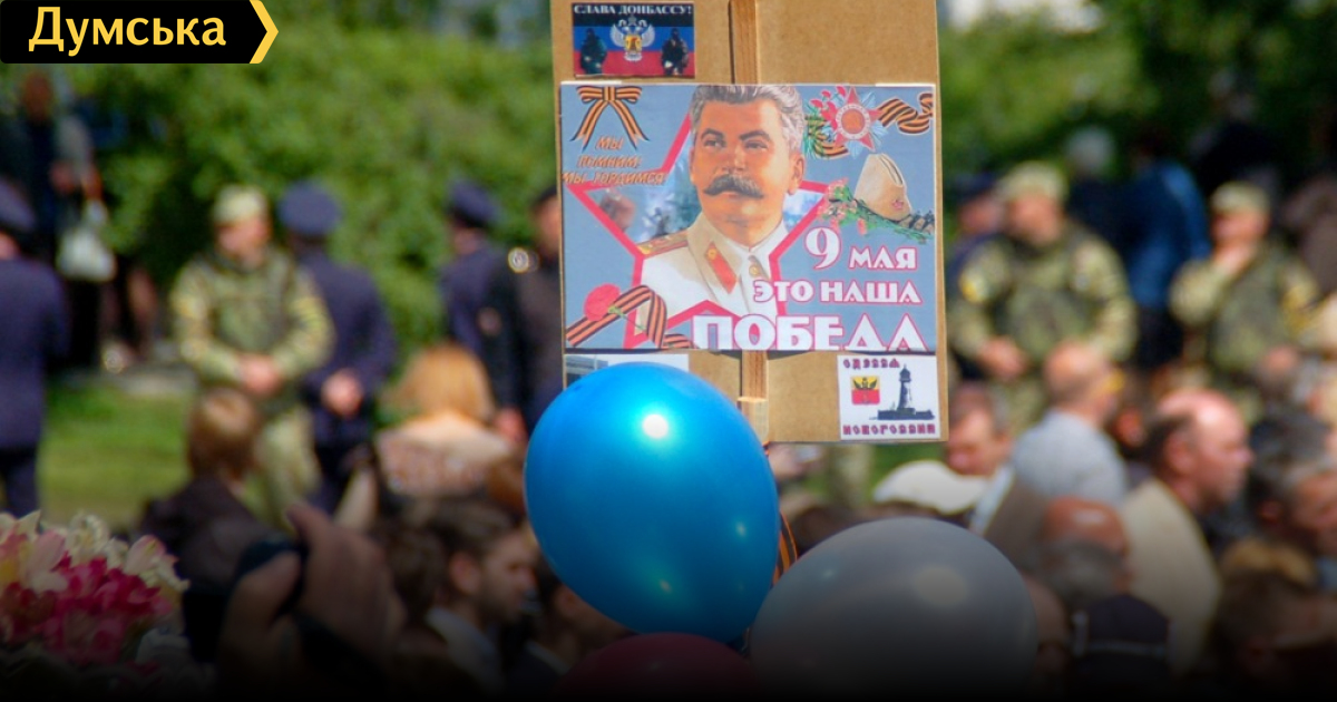 На Аллее Славы собрались сотни людей, некоторые — с красными флагами, георгиевскими ленточками и портретами Сталина. Была и символика террористических организаций.