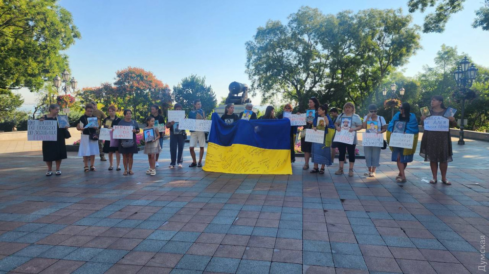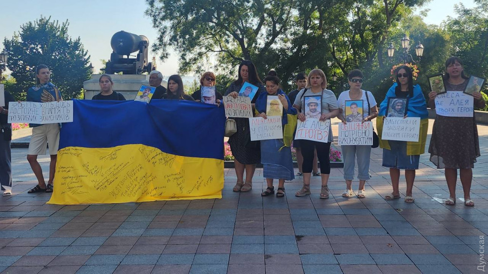 Родичі загиблих військовослужбовців Збройних сил України зібралися вранці 15 серпня біля входу в Одеську міськраду з вимогою створити Алею Героїв у парку Шевченка.