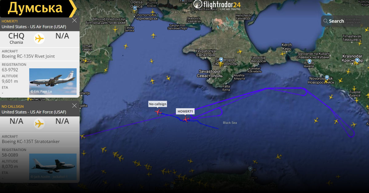 Американская авиация продолжает ежедневный мониторинг черноморского региона. Сегодня, вылетев в 6 утра с авиабазы Ханья, что на греческом острове Крит, над Черным морем появился американский разведчик Boeing RC-135V Rivet Joint. Самолет сделал несколько проходов вдоль крымского побережья на высоте 9,5 километров, максимально приблизившись к береговой линии на расстояние около 40 км. В 10:30 (время киевское) к нему приблизился самолет-заправщик Boeing KC-135T Stratotanker, но произошла ли передача топлива — неизвестно. Сразу после сближения «танкер» ушел на аэродром вылета. Около 11:30 RC-135V прекратил выполнение задания и направился обратно на Крит. ОБНОВЛЕНО В 14:00. В районе Севастополя и до мыса Тарханкут ситуацию контролирует еще один американский разведчик, предположительно P-8A Poseidon, прибывший с авиабазы Сигонелла. СМЕРТЬ РОСІЙСЬКИМ ОКУПАНТАМ! Помітили помилку? Виділяйте слова з помилкою та натискайте control-enter |