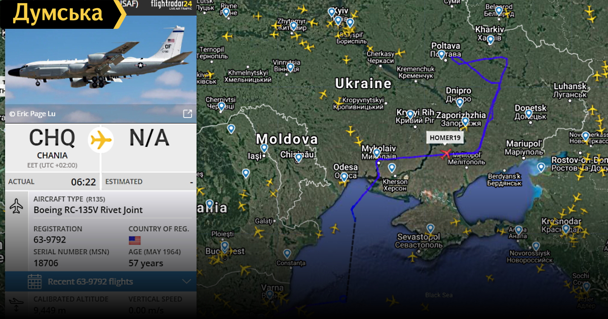 Несколько американских самолетов сегодня рано утром появились над Черным морем. В три часа ночи с британской авиабазы Милденхолл взлетел американский заправщик KC-135 Stratotanker, чтобы отправиться в наш регион. Чуть позже с американской авиабазы Чания, что на острове Крит, взлетел стратегический разведчик ВВС США Boeing RC-135V Rivet Joint. Встреча разведчика с заправщиком произошла около 8 часов утра, RC-135V принял от «Стратотанкера» несколько десятков тонн керосина, чтобы обеспечить длительное нахождение в небе в районе украинского Донбасса и Приазовья. В 9 часов утра Boeing RC-135V Rivet Joint пересек береговую линию и приступил к разведывательному полету, который продолжится до наступления темноты. Полет проходит по линии Николаев – Мелитополь – Краматорск – Изюм – Полтава. СМЕРТЬ РОСІЙСЬКИМ ОКУПАНТАМ! Помітили помилку? Виділяйте слова з помилкою та натискайте control-enter |