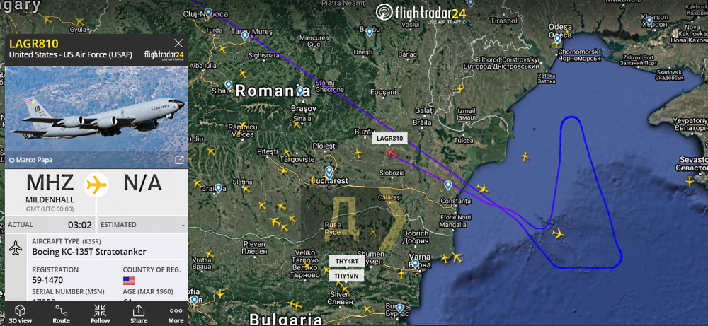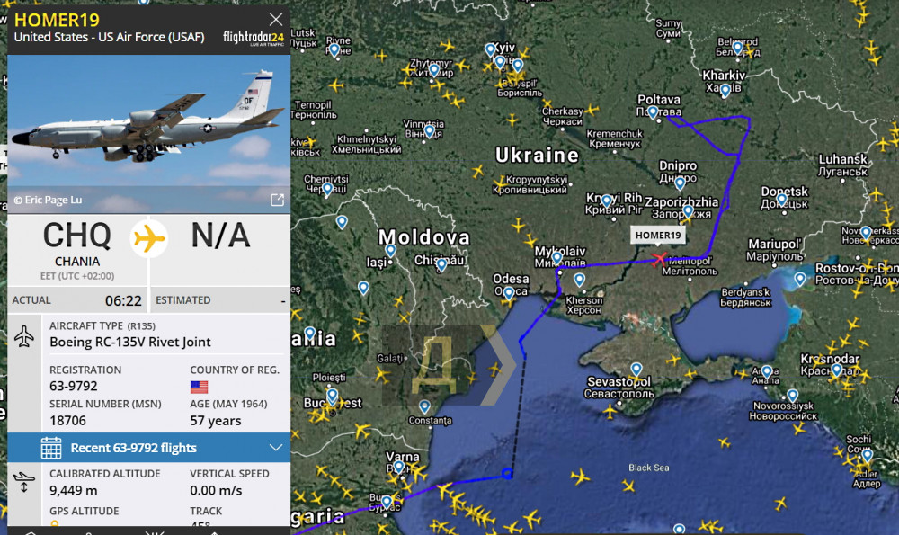 В 9 часов утра Boeing RC-135V Rivet Joint пересек береговую линию и приступил к разведывательному полету, который продолжится до наступления темноты. Полет проходит по линии Николаев – Мелитополь – Краматорск – Изюм – Полтава.