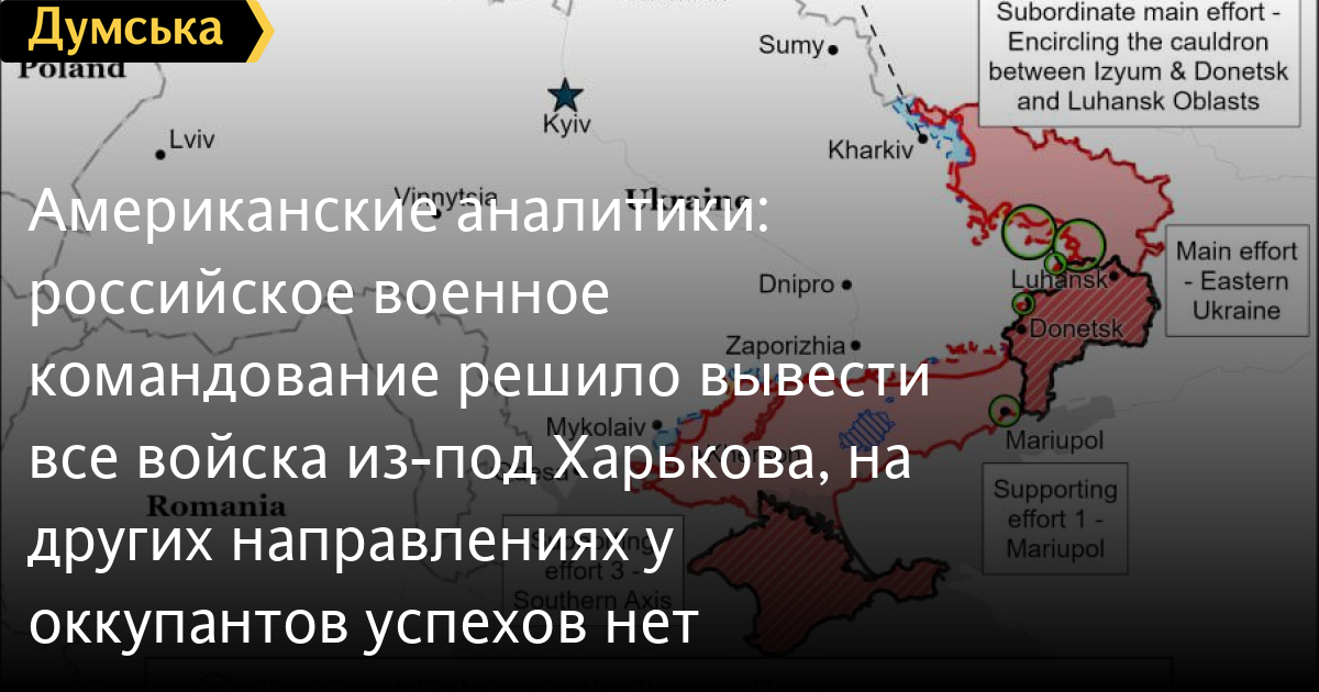 «Москва сосредоточена на проведении вывода войск и не пытаться удерживать свои позиции вблизи города… Таким образом, Украина, похоже, выиграла Харьковскую битву. Украинские войска помешали окружить город, не говоря уже о захвате Харькова, а затем изгнали вражеские войска, как они это сделали с российскими войсками, пытавшимися захватить Киев», — говорится в отчете организации.
