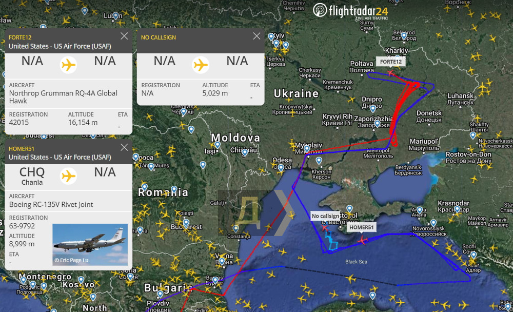 Не ограничившись облетом кавказского побережья РФ и оккупированного Крыма, стратегический разведчик прошел вдоль линии фронта по маршруту Очаков — Николаев — Мелитополь- Изюм — Полтава, после чего вернулся в черноморское небо, продолжив патрулирование Крыма.