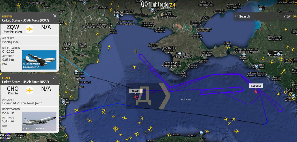 Два стратегических разведчика — Boeing E-8C и Boeing RC-135W Rivet Joint, с утра до вечера висели над черноморским побережьем Крыма и Кавказа, от мыса Тарханкут до Сочи.