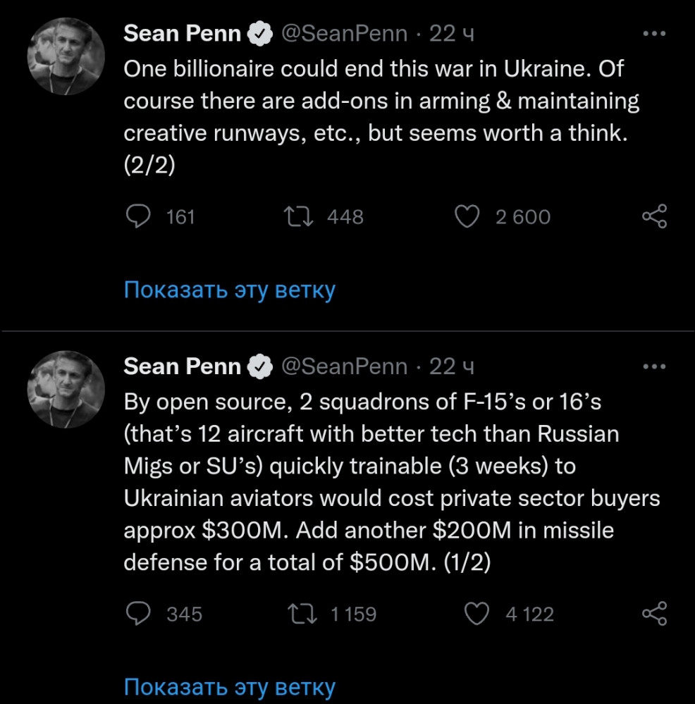 «Один миллиардер мог бы положить конец этой войне в Украине. Конечно, есть дополнения по вооружению и обслуживанию взлетно-посадочных полос и т. д, но, похоже, стоит подумать», — написал Пенн.