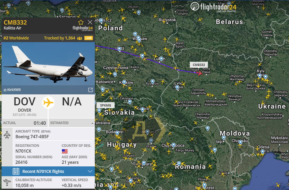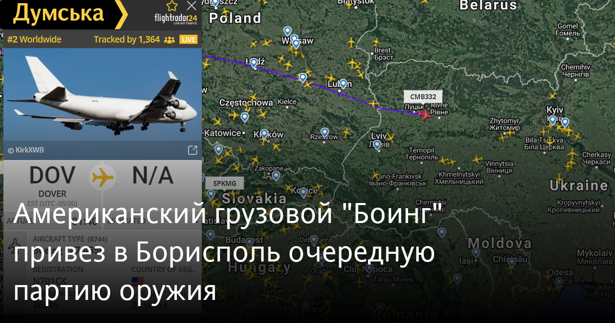 Американский грузовой Boeing 747-4B5F, взлетев ночью с американской базы Довер, днем приземлился в Борисполе.