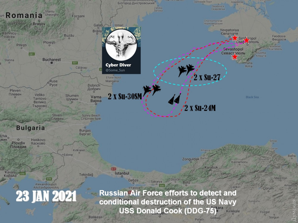 Эсминец атаковало шесть бортов РФ, взлетевших с трех крымских военных аэродромов. Пара истребителей Су-27 вылетела из Бельбека, вблизи Севастополя, два Су-30СМ с аэродрома Новофедоровка (Саки), а разведчик Су-24МР и ударный Су-24М с аэродрома Гвардейское, что под Симферополем.