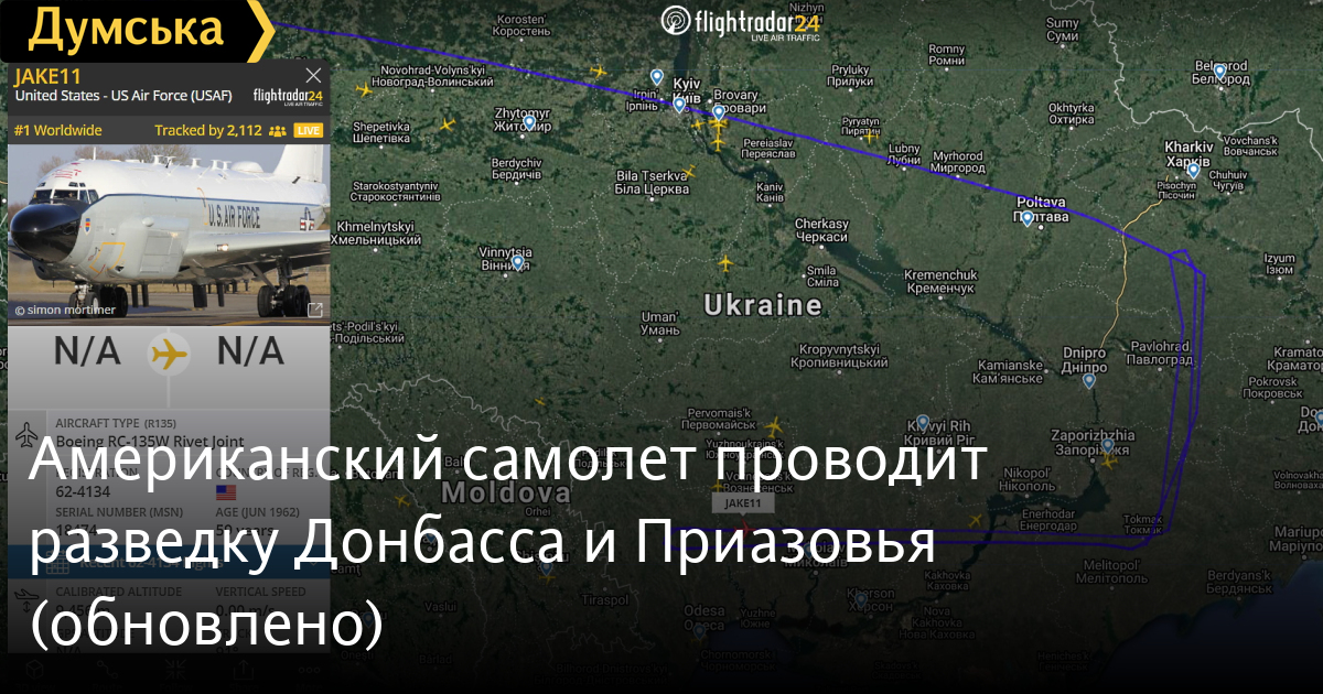 Как сообщает корреспондент «Думской», сегодня днем разведчик Boeing RC-135W Rivet Joint патрулирует воздушное пространство над линией фронта и Приазовьем.