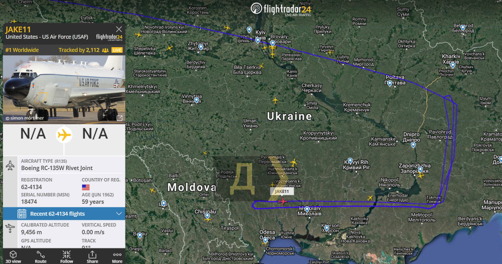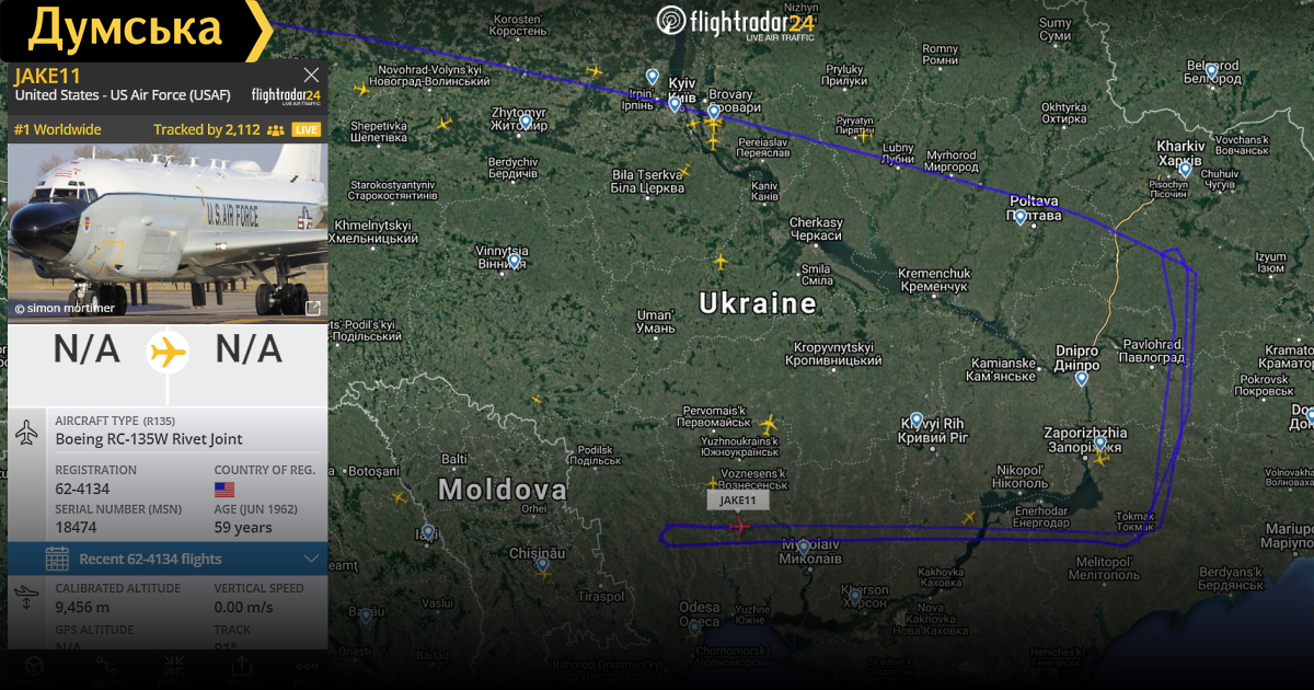 Британец Boeing RC-135W, взлетев с авиабазы Милденхолл, прошел над Одессой и ведет разведку крымского побережья над Черным морем.