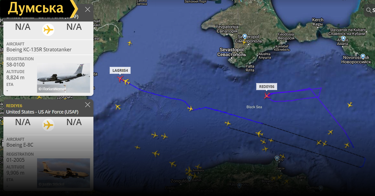 Над Черным морем кружит американский самолет управления и целеуказания: дозаправился и следит за Крымом и российским побережьемАмериканские разведчики продолжают мониторить ситуацию в черноморском регионе. В 12:30 над Черным морем появились заправщик Boeing KC-135R Stratotanker и самолет управления и целеуказания Boeing E-8C. Самолеты сблизились и вместе держали курс в центральную часть Черного моря, где в 14:00 состоялась передача топлива разведчику, который приступил к выполнению задания. «Боинг» мониторит обстановку на высоте 10000 метров на расстоянии около 150 километров от крымского побережья. Интересно, что антенна бокового обзора AN/APY-3 с синтезированной апертурой, установленная на Boeing E-8C, благодаря специальной системе, позволяет обнаруживать цели на растоянии от 50 до 250 км от самолета и площади более 50 тысяч квадратных километров. Разведданные поступают в штабы и разведцентры в режиме реального времени. СМЕРТЬ РОСІЙСЬКИМ ОКУПАНТАМ! Помітили помилку? Виділяйте слова з помилкою та натискайте control-enter |