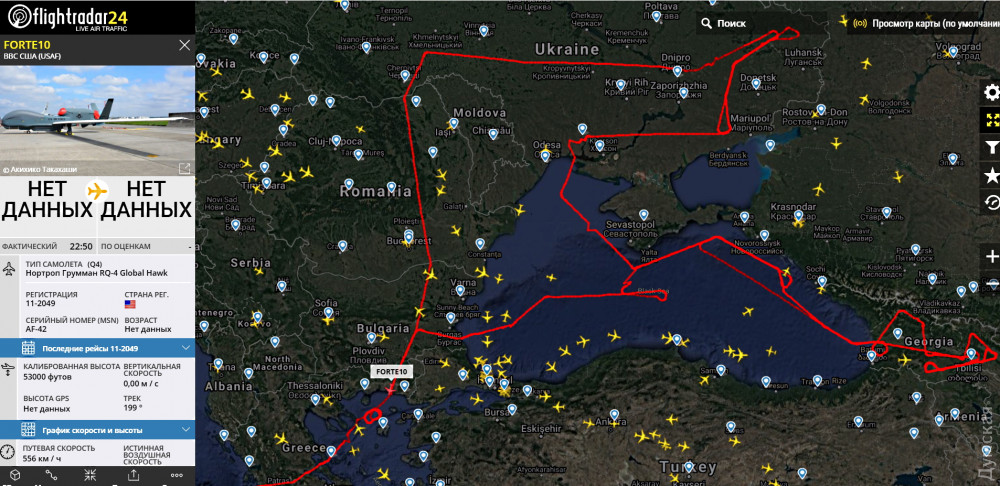 Сегодня утром американский беспилотный стратегический разведчик Global Hawk RQ-4 провел инспекцию горячих точек Черноморского региона.