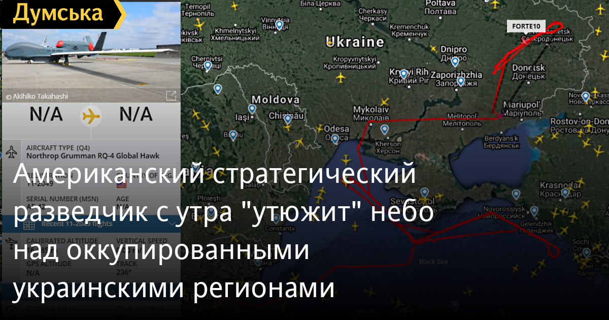 Американский беспилотный самолет RQ-4B Global Hawk целый день осуществляет разведку оккупированных украинских территорий в Крыму, Донецкой и Луганской областях.