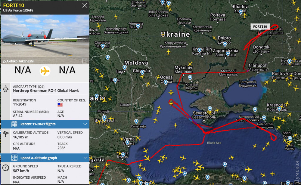 Ближе к вечеру, пройдя над Николаевом и Мелитополем, «Глобал Хаук» вышел к линии боевого соприкосновения Украины с РФ и приступил к разведке Донецкой и Луганской областей.