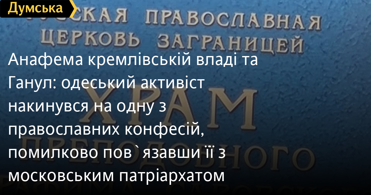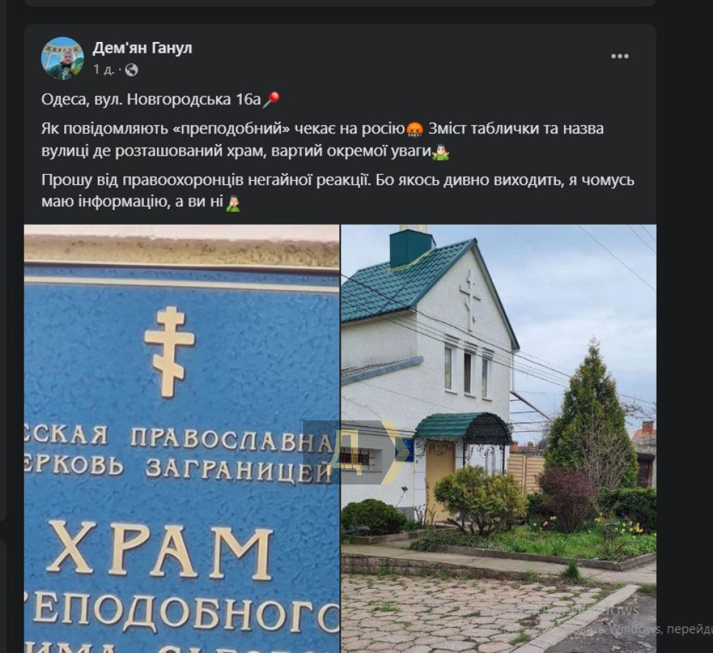 Почалося все з того, що Дем'ян Ганул опублікував на своїй сторінці в соцмережах таке повідомлення: «Одеса, вул. Новгородська, 16а. Як повідомляють, «преподобний» чекає на росію. Зміст таблички і назва вулиці, де розташований храм, вартий окремої уваги. Прошу від правоохоронців негайної реакції. Бо якось дивно виходить, я чомусь маю інформацію, а ви ні».