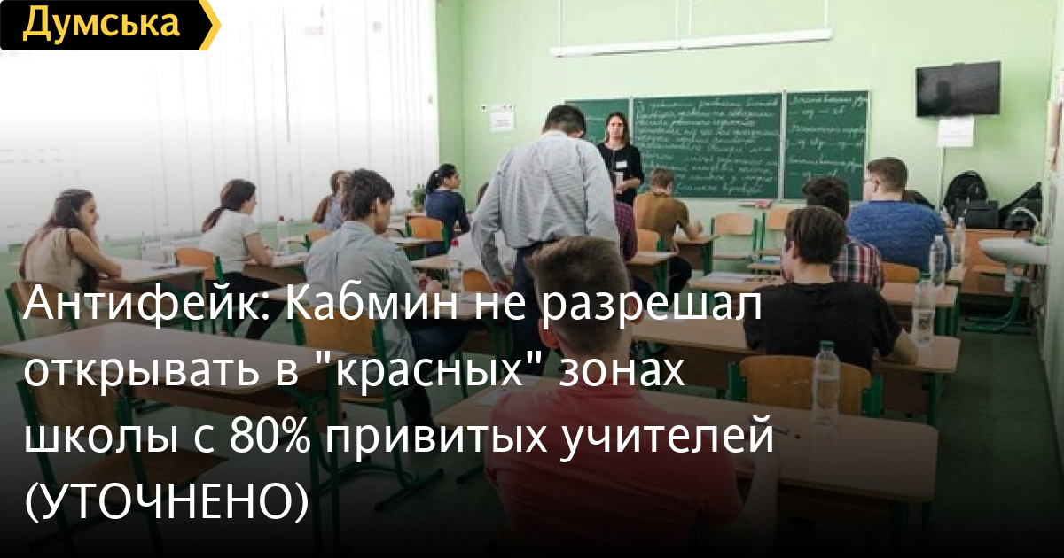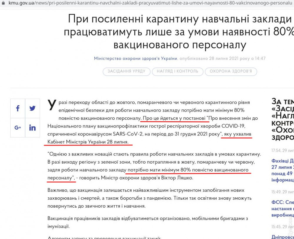 Министр здравоохранения Виктор Ляшко заявил, что Кабмин якобы разрешил открывать учебные заведения в «желтых», «оранжевых» и «красных» зонах при условии вакцинации 80% персоналах. Такое сообщение появилось на украинском правительственном портале.