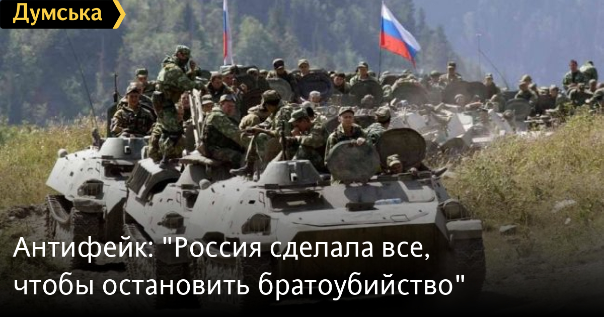 Ну а слова о том, что Россия «сделала все, чтобы остановить братоубийство», могли быть очень смешным, если бы за ними не стояли тысячи погибших людей. В память об этих «действиях» ставят мемориалы. Один из них, БМД псковских десантников-отпускников, захваченный в бою одесскими милиционерами из «Шторма», каждый может увидеть у нас на территории Военной академии.