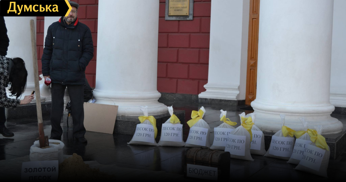 Активисты общественной организации «Антикоррупционный офис» сегодня с утра провели акцию у здания мэрии. Так, на крыльцо принесли мешки с песком, а человек в маске, похожей на лицо одесского мэра, рассказал, как простой стройматериал превращается в золотой, и тем самым «пилится» городской бюджет. «Уже три года мэрия закупает песок у одного и того же «удачливого» предпринимателя. В этом году купили 7 тысяч тонн по цене 245 грн, тогда как на рынке его продают по 120. В тендере участвовало всего две компании. Ущерб городскому бюджету от коррупционных аппетитов власти — минимум 665 тыс гривен», — пояснили азы «распила» участники акции. СМЕРТЬ РОСІЙСЬКИМ ОКУПАНТАМ! Помітили помилку? Виділяйте слова з помилкою та натискайте control-enter |