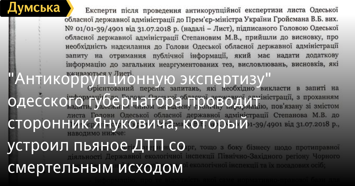 «Антикоррупционную экспертизу» одесского губернатора проводит сторонник Януковича, который устроил пьяное ДТП со смертельным исходомПредставители «общественного совета при Государственной экологической инспекции Украины» провели «антикоррупционную экспертизу» письма одесского губернатора Максима Степанова к премьер-министру, в котором он просит разогнать экоинспекцию как коррупционную структуру. «Наверное, я больно наступил на яйца парням, которые наживаются на коррупции в портах», — прокомментировал это сам Максим Степанов. Делегацию «антикоррупционеров», явившихся к руководителю ОГА, возглавлял некий Игорь Степанович Мариен, являющийся учредителем и председателем 15 различных общественных организаций и ООО. Кроме того, он был активистом ОО «Общественное движение поддержки реформ Президента Украины В.Ф. Януковича». 11 марта 2012 года Игорь Мариен стал героем публикации «Думской» — после того, как устроил ДТП на Ризовской улице. Находясь в состоянии алкогольного опьянения за рулем своей «Тойоты Лендкрузер», он выехал на тротуар, разметал торговые точки «блошиного» рынка и сбил прохожего, который скончался на месте преступления. При этом очевидцы утверждали, что аварию Мариен устроил намеренно — случившемуся предшествовала его ссора с продавцами. 9 сентября 2013 года Приморский районный суд Одессы приговорил «общественника» к лишению свободы сроком на 3 года 6 месяцев. Кроме того, он должен возместить супруге и ребенку погибшего материальный и моральный ущерб в размере 630 тысяч грн. СМЕРТЬ РОСІЙСЬКИМ ОКУПАНТАМ! Помітили помилку? Виділяйте слова з помилкою та натискайте control-enter