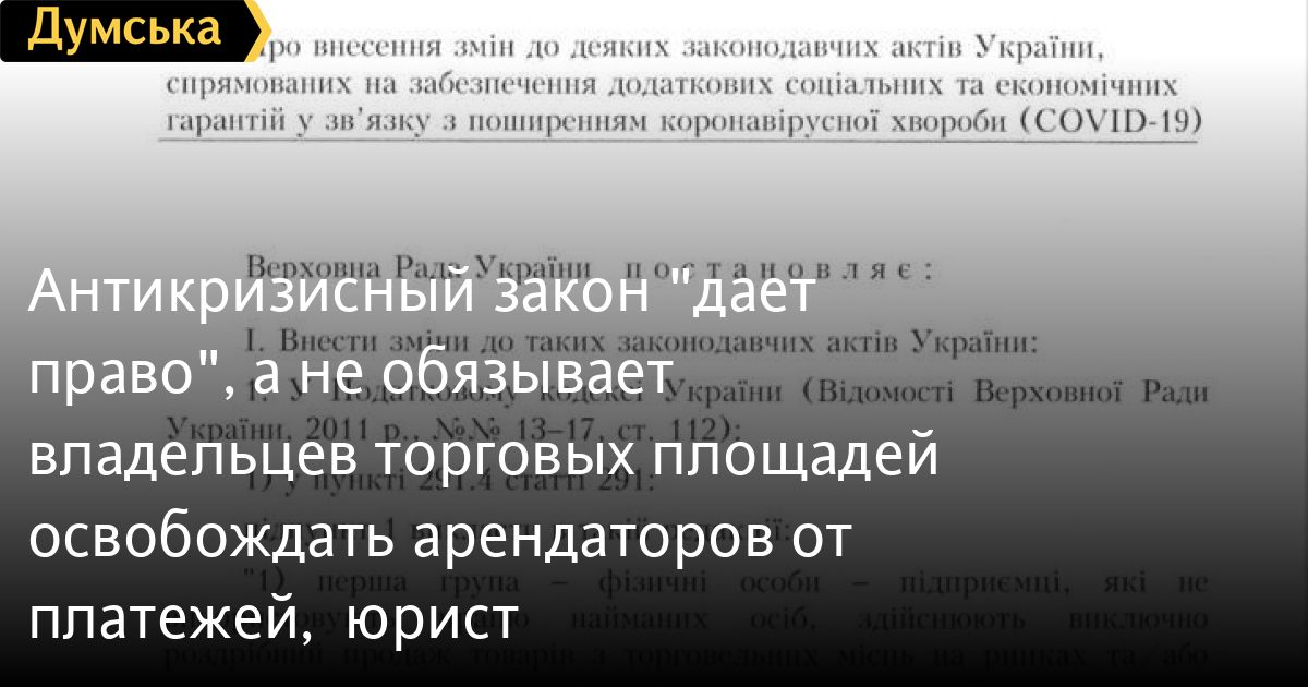 «Считаем наиболее верным при текущих обстоятельствах применение положений части 6 статьи 762 Гражданского кодекса Украины, которые освобождают арендатора от уплаты арендных платежей в случае невозможности использования арендованного помещения в силу обстоятельств, за которые арендатор не отвечает. К тому же, Законом Украины 540-IX от 30.03.2020 Верховная Рада Украины закрепила в заключительных положениях Гражданского кодекса возможность освобождения нанимателя от платы за пользование имуществом в соответствии с частью 6 статьи 762 Гражданского кодекса Украины на время карантина», — говорится, в частности, в статье адвоката Романа Арсоева.
