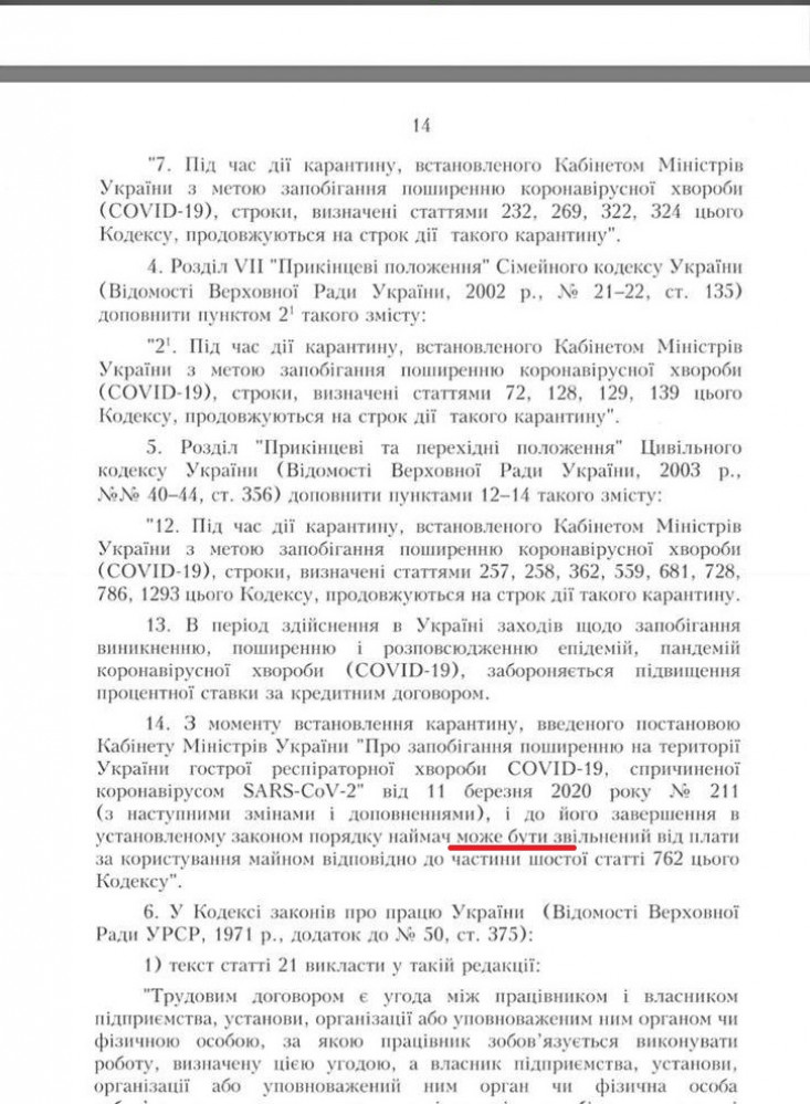 Так, после подписания закона Заключительные и переходные положения Гражданского кодекса Украины дополнились пунктом 14, который гласит: «Наниматель может быть освобожден от уплаты арендной платы на период карантина в порядке ч.6 ст. 762 Гражданского кодекса».