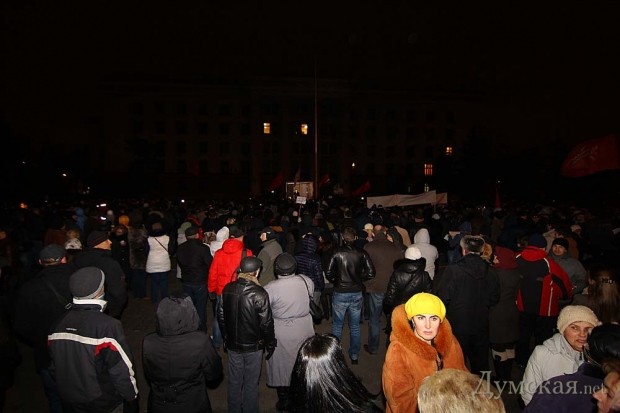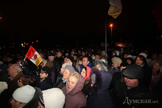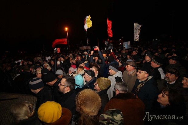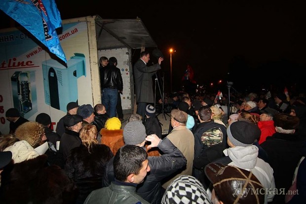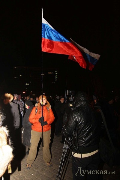 Митинг «Антимайдана» собрал сегодня под стенами Дома профсоюзов на Куликовом поле более двух тысяч людей (по данным организаторов, пять-шесть тысяч). Перед людьми, пришедшими с красными копиями Знамени Победы и российскими триколорами, выступали с импровизированной сцены, коей стал кузов грузового автомобиля, Антон Давидченко, Ростислав Барда, Юрий Ткачев, Нина Кочановская. Рискнули появиться перед одесситами и два депутата: регионал Маркин и коммунист Полищук.