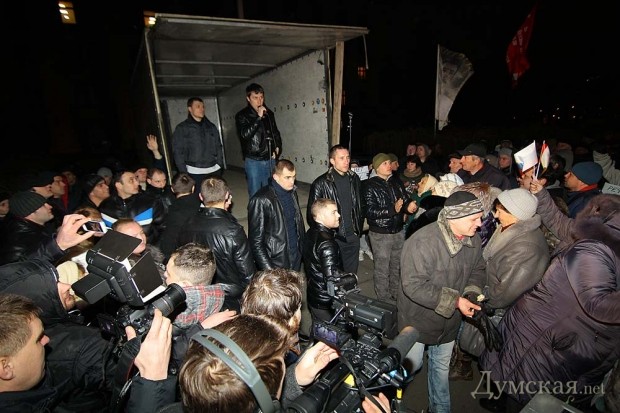 «Депутаты Партии регионов предали своих избирателей. Это мажоритарщики, которые шли с одними программами, а сейчас голосуют вопреки обещаниям. Мы хотим обратиться к губернатору и депутатам областного и городского советов с требованием ответить, с кем они: с одесситами или с новой властью? Депутаты у нас трусы. А мы не хотим, чтобы нам навязывали, на каком языке говорить и каких героев чтить. Но при этом мы хотим, чтобы все факты грабежа нашего города, застройки склонов и других финансовых махинаций расследовались должным образом»