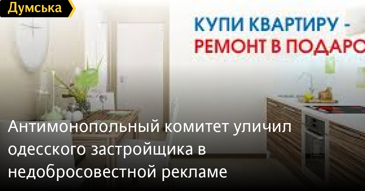 Антимонопольный комитет уличил одесского застройщика в недобросовестной рекламеВ недобросовестной рекламе уличил Антимонопольный комитет Украины одесского застройщика. Как сообщили в областном отделении ведомства, компания разместила на билбордах в Приморском районе города рекламу с надписью «Купи квартиру — ремонт в подарок». Антимонопольщики установили, что под словами «в подарок» имелось в виду участие покупателя квартиры в розыгрыше, победитель которого должен был получить сертификат, дающий возможность приобрести отделочные работы за 1 грн. Застройщик признался, что во время действия этой акции ни один клиент сертификата не получил. Подобная реклама, констатировали в АМКУ, вводит в заблуждение, может нанести ущерб гражданам по причине недостоверности и потом запрещена профильным законом. Антимонопольный комитет потребовал убрать указанные рекламные средства, что и было сделано, отмечается в сообщении. СМЕРТЬ РОССИЙСКИМ ОККУПАНТАМ! Заметили ошибку? Выделяйте слова с ошибкой и нажимайте control-enter |