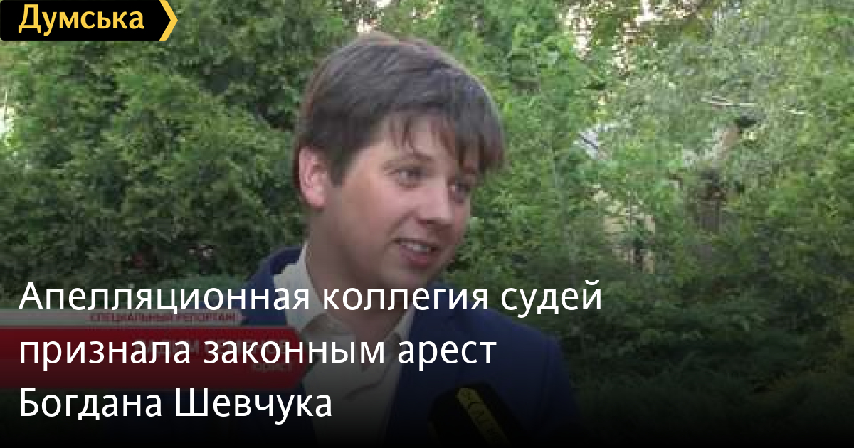 Дело Богдана Шевчука. Тринадцатого июня апелляционная коллегия судей признала законным арест главы Затокской поселковой земельной комиссии. Апелляция осталась без удовлетворения СМЕРТЬ РОСІЙСЬКИМ ОКУПАНТАМ! Помітили помилку? Виділяйте слова з помилкою та натискайте control-enter Думская ТВ. Сюжеты: