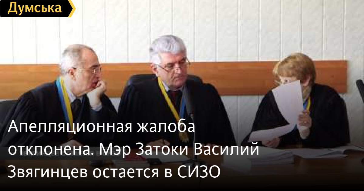 Апелляционная жалоба отклонена. Мэр Затоки Василий Звягинцев останется в СИЗО до конца досудебного расследования. Напомним, чиновника обвиняют в превышении служебных полномочий и разбазаривании рекреационных земель СМЕРТЬ РОССИЙСКИМ ОККУПАНТАМ! Заметили ошибку? Выделяйте слова с ошибкой и нажимайте control-enter Думская ТВ. Сюжеты: