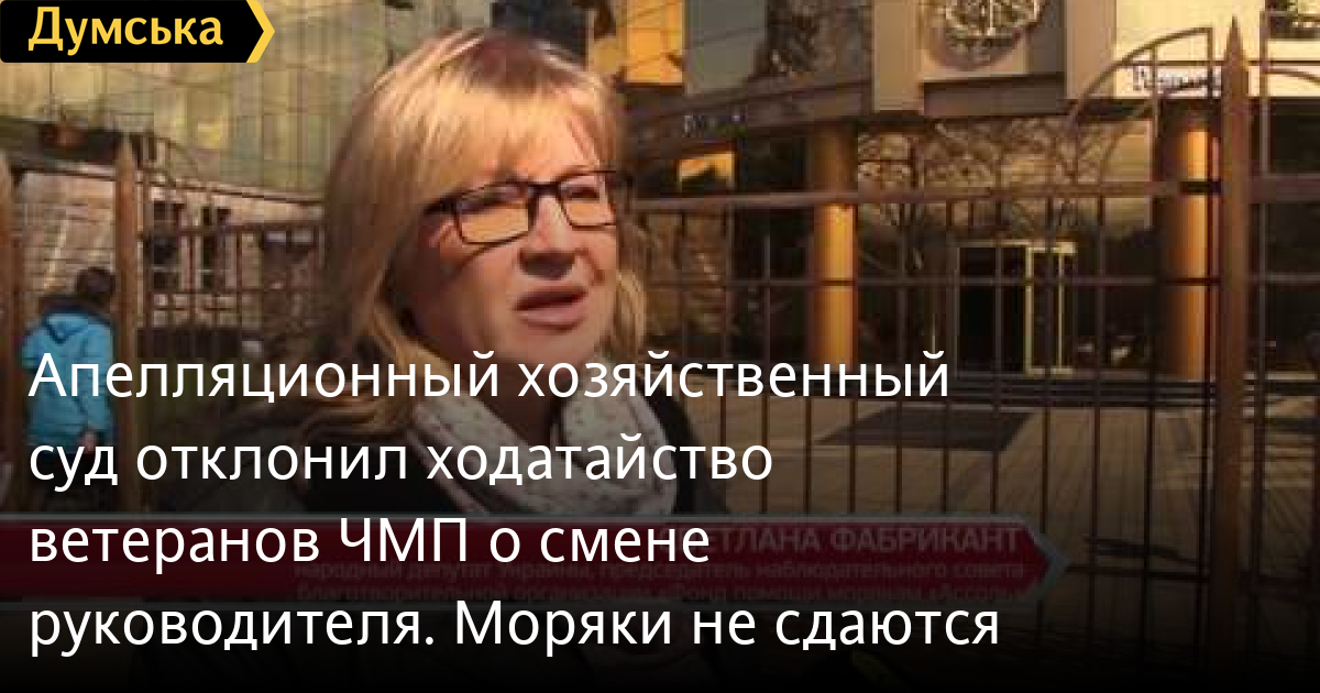 Апелляционный хозяйственный суд отклонил ходатайство ветеранов ЧМП о смене руководителя. Моряки не сдаютсяТрудовой коллектив Черноморского морского пароходства обратился в Апелляционный хозяйственный суд с ходатайством о смене руководителя. Ветераны судоходной компании уверены: после прихода новых лиц, ЧМП разворуют окончательно. А то незначительное имущество, которое за ним еще числится, уйдет с молотка. СМЕРТЬ РОССИЙСКИМ ОККУПАНТАМ! Заметили ошибку? Выделяйте слова с ошибкой и нажимайте control-enter Думская ТВ. Сюжеты: