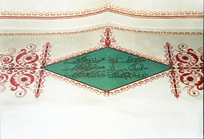 Польский писатель Юзеф Крашевский, побывавший во дворце в 1843 году, сообщил, что плиты «черные, словно Камень Каабы, а буквы – украшены позолотой». Сегодня фон синий, а позолота скрыта под белой краской – результат неумелой реставрации еще советского времени. Буквы явно наводили заново краской мастера, не знающие азов реставрационного дела, посему надписи искажены. Но прочитать их можно.