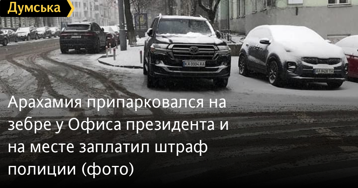 Старший лейтенант патрульной полиции Киева оштрафовал на 510 гривен главу парламентской фракции «Слуги народа» Давида Арахамию, который сегодня припарковался на пешеходном переходе у Офиса президента на Банковой.