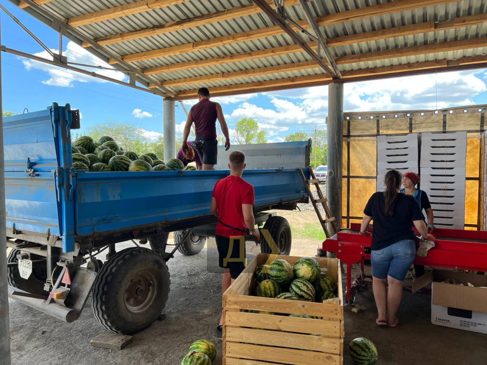 Это фермерское хозяйство находится в Измаильском районе. Уже неделю на полях кипит работа. Женщины выбирают и срезают спелые арбузы, мужчины собирают их и грузят в прицепы.