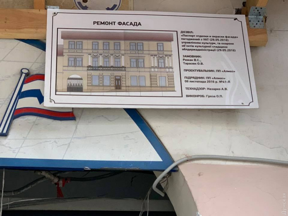 Если верить информационному щиту, разрешение на отделку и покраску фасада еще в мае 2018 года получили некие Рыжак В.С. и Тарасюк О.В. Эти работы согласованы с управлением культуры и охраны объектов культурного наследия Одесской ОГА.