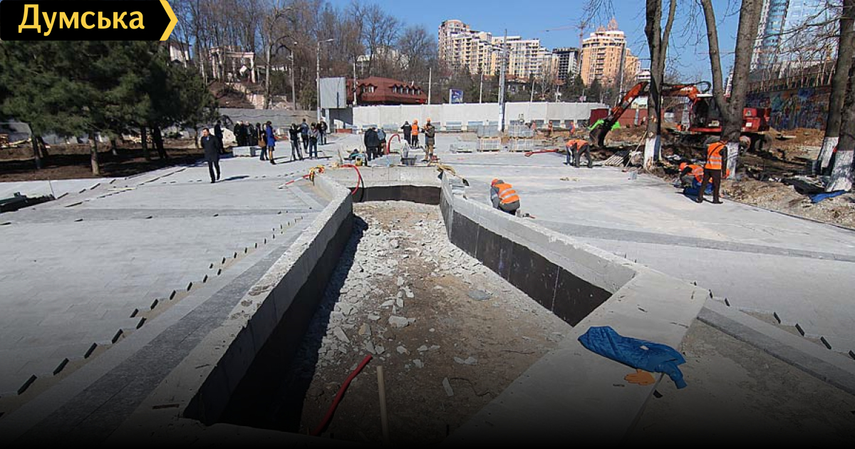 «Сейчас рабочие покрывают пешеходную часть гранитной плиткой, а уже сформированные газоны, где обещают посадить пальмы, и чаши фонтанов облицовывают белым мрамором.»