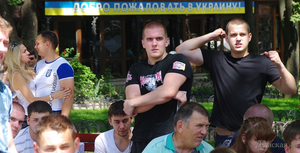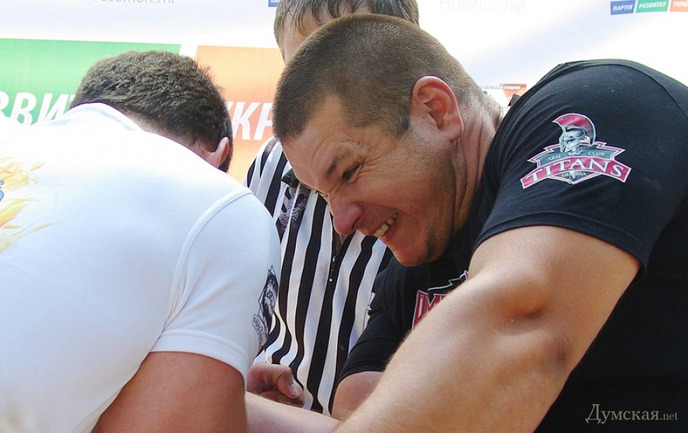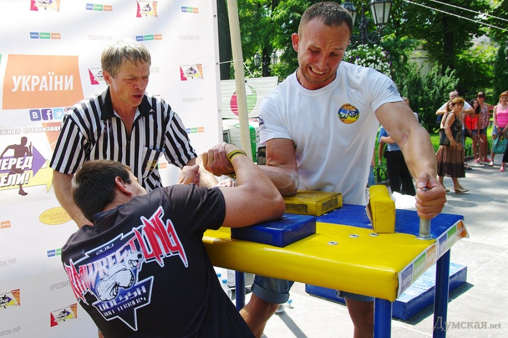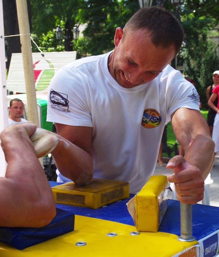 Уже второй год подряд в Одессе проходит чемпионат Украины по армрестлингу «Битва титанов». В этот раз мероприятие организованное молодежной организацией «Вперед к цели» состоялось в Городском саду. За поединками наблюдали корреспонденты «Думской». Ни военная обстановка в стране, ни температура +35 в тени не остановили украинских спортсменов. В раскаленном сквере, где даже столетние платаны не спасали от жары, собрались 93 профессиональных рукоборца из 15 регионов страны. Возраст силачей – от 17 до 35 лет. Были среди участников чемпионата и три девушки. Представительницы слабого пола привыкли ломать стереотипы, доказывая что могут дать фору большинству мужчин: «Я часто соревнуюсь с мужчинами в пабах, когда берут на слабо. У всех глаза на лоб лезут, когда я побеждаю уже на первой минуте», – рассказывает многократная чемпионка Украины и призер чемпионата Европы киевлянка Ирина Рожещенко. Девушка говорит, что в мужской спорт попала случайно. Как-то раз в тренажерном зале инструктор в шутку предложил померяться силами на руках. Потом это переросло в серьезное увлечение. На просьбу поиграть бицепсами на камеру Ирина рассмеялась: дескать, в армрестлинге мускулатура – не главное. Чтобы одержать победу в этом виде спорта, нужны сильные связки, взрывной старт и владение различными техниками. Конек нашей собеседницы – захват сверху. Победителем чемпионата стал 25–летний одессит Петр Маргарин. СМЕРТЬ РОСІЙСЬКИМ ОКУПАНТАМ! Помітили помилку? Виділяйте слова з помилкою та натискайте control-enter |