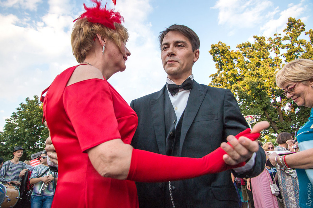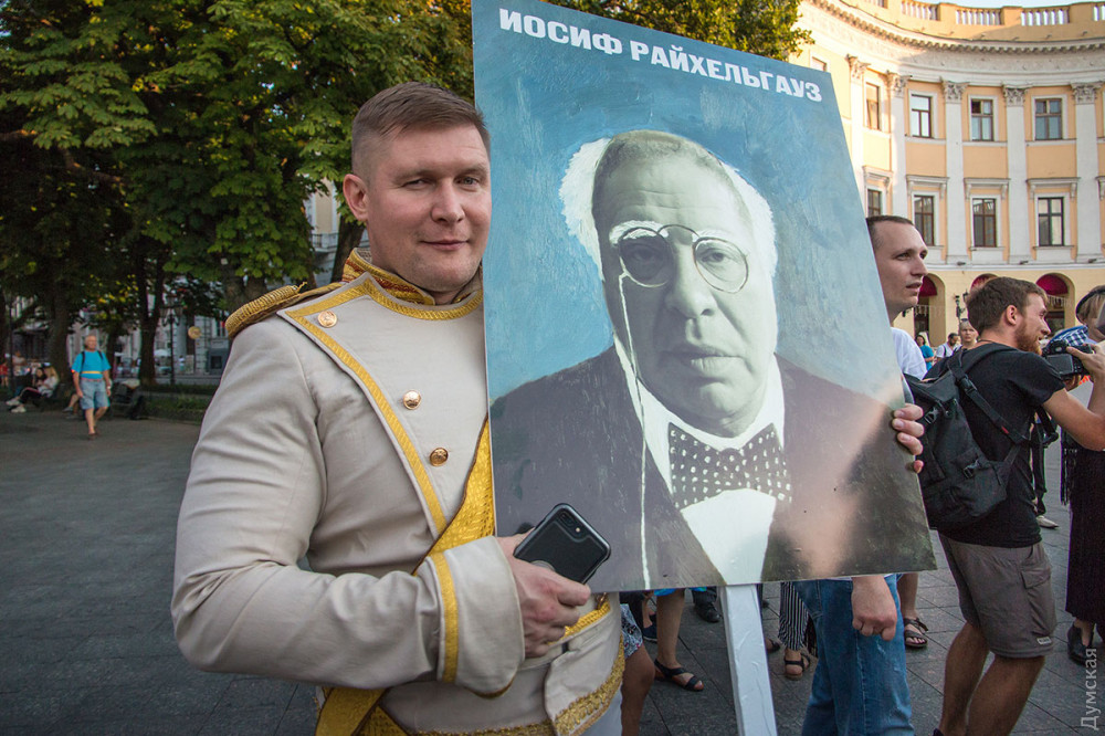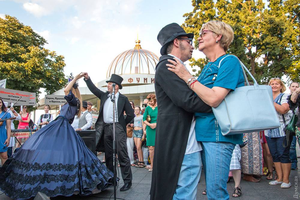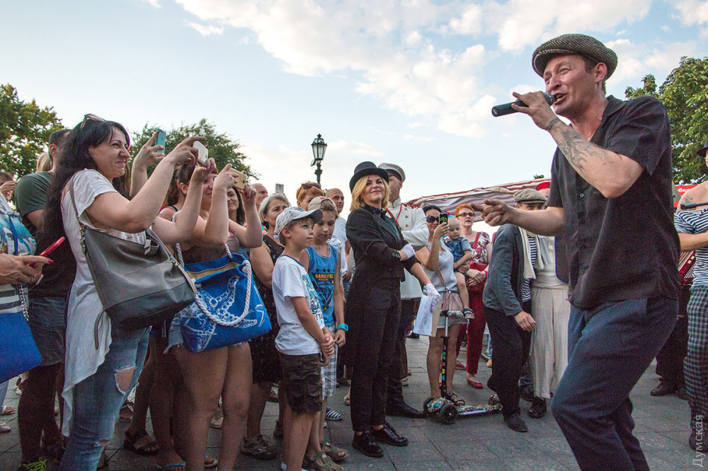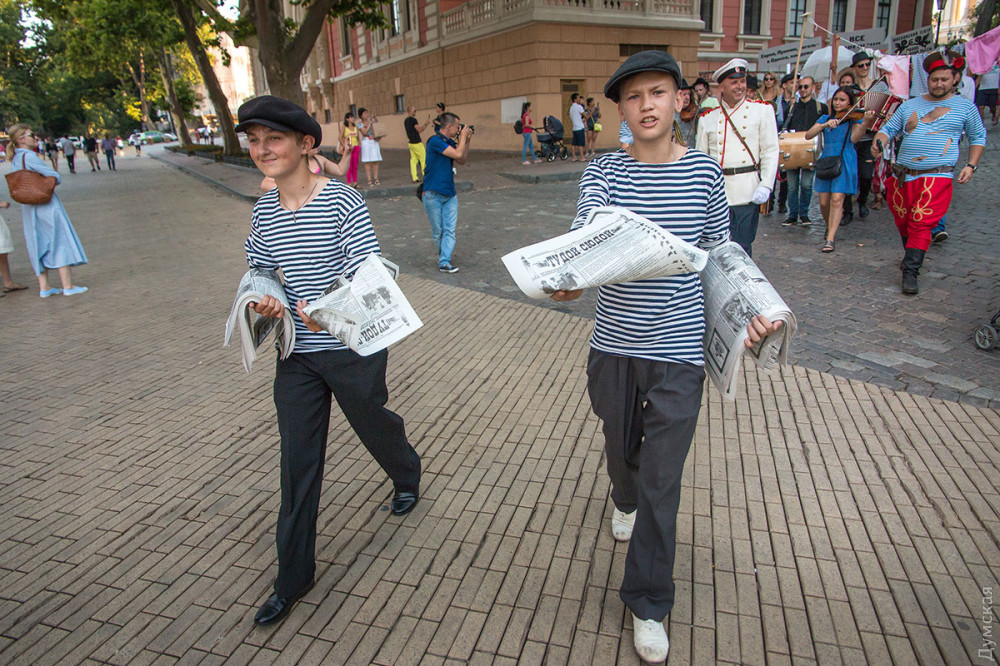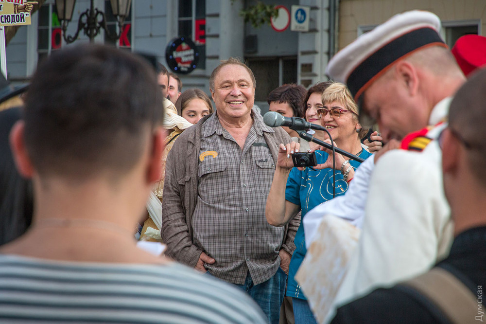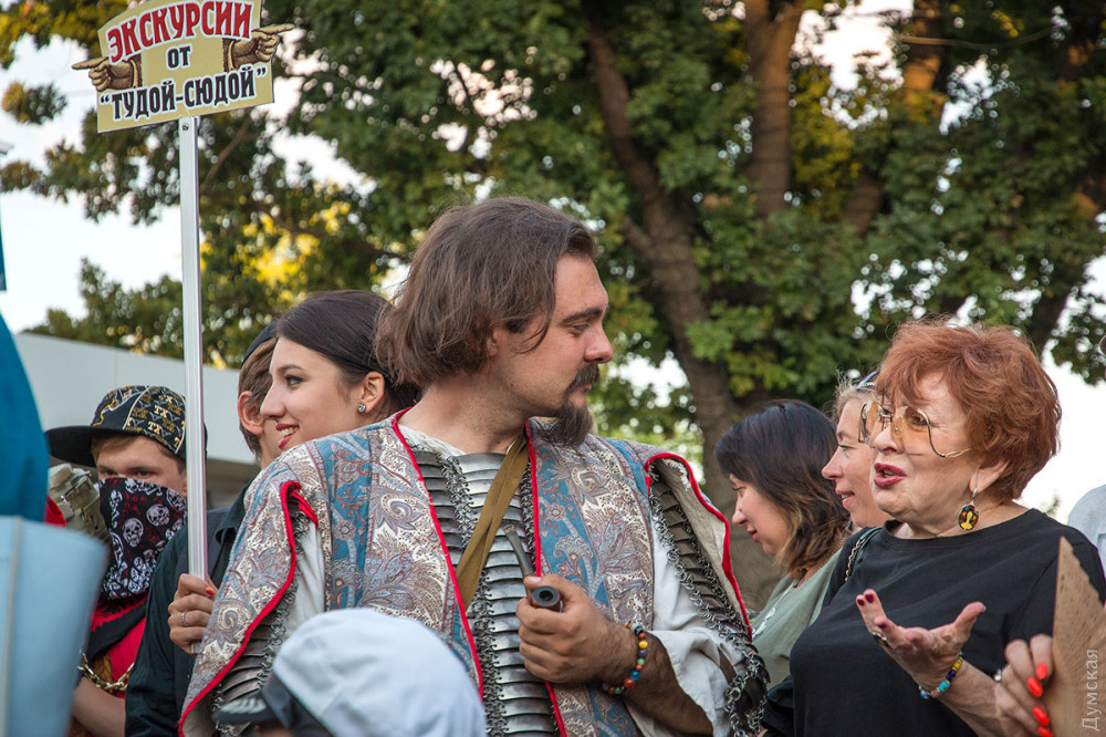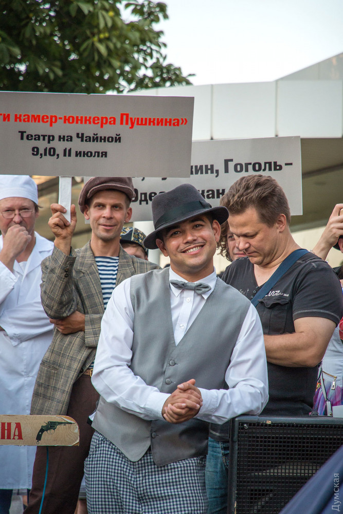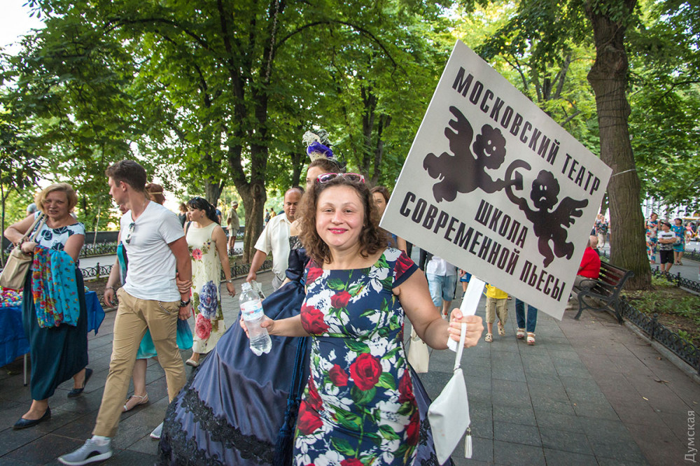 Участники шествия в образах героев одесских анекдотов яркой и громкой толпой проследовали по Приморскому бульвару под аккомпанемент оркестра. Таким образом выдающийся одесский театральный режиссер проанонсировал три новых спектакля, которые с 7 по 11 июля пройдут на лучших подмостках города.
