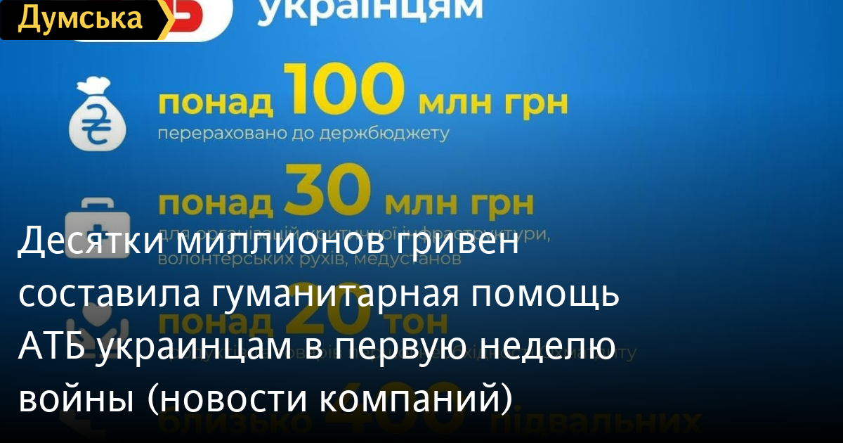 Десятки миллионов гривен составила гуманитарная помощь АТБ украинцам в первую неделю войны (новости компаний)За первую неделю военной агрессии против Украины корпорация АТБ предоставила украинцам помощь продуктами питания и товарами первой необходимости на десятки миллионов гривен. Помощь получили организации критической инфраструктуры, волонтерские движения, медучреждения, городские и сельские администрации, места размещения переселенцев, население в горячих точках страны. Для поддержки обороноспособности страны корпорация АТБ перечислила в государственный бюджет 100 млн гривен авансового налогового платежа, рассказали в компании. Несмотря на обстрелы и сложную ситуацию в Киеве, столичный Охматдит, где лечатся онкобольные дети со всей страны, получил 20 тонн продуктов и товаров первой необходимости. «С начала военной агрессии мы все оказались на единой линии фронта. Фронта, где все решает не оружие и деньги, а люди. Люди, которые каждый день делают свое дело, отдавая все свои силы и энергию для общего дела, — рассказал о деятельности компании и ее сотрудников Борис Марков, генеральный директор корпорации АТБ. — Именно они, рискуя своей жизнью, открывают магазины и работают на кассах. Именно они ведут фуры под ракетными ударами и авианалетами. Именно они под обстрелами и военной блокадой забирают товар на складах. Уверенно, спокойно и решительно делают свое дело». В городах прямого боевого столкновения сформированы опорные магазины «АТБ» для максимального обеспечения населения продуктами питания и товарами первой необходимости. Вся актуальная информация для населения оперативно размещается на сайтах компании и на страницах в соцсетях. Для мирных жителей городов, которые подвергаются авианалетам и бомбардировкам, компания предоставила подвальные помещения своих работающих магазинов под бомбоубежища, где также сформированы запасы питьевой воды. «С начала войны вся большая команда корпорации АТБ работает в усиленном режиме 24/7. Делает все возможное, чтобы максимально обеспечить население страны продуктами питания и товарами первой необходимости и предоставить самую широкую помощь. Мы не останавливаемся. Все будет Украина!» — отметили в компании. Заметили ошибку? Выделяйте слова с ошибкой и нажимайте control-enter |