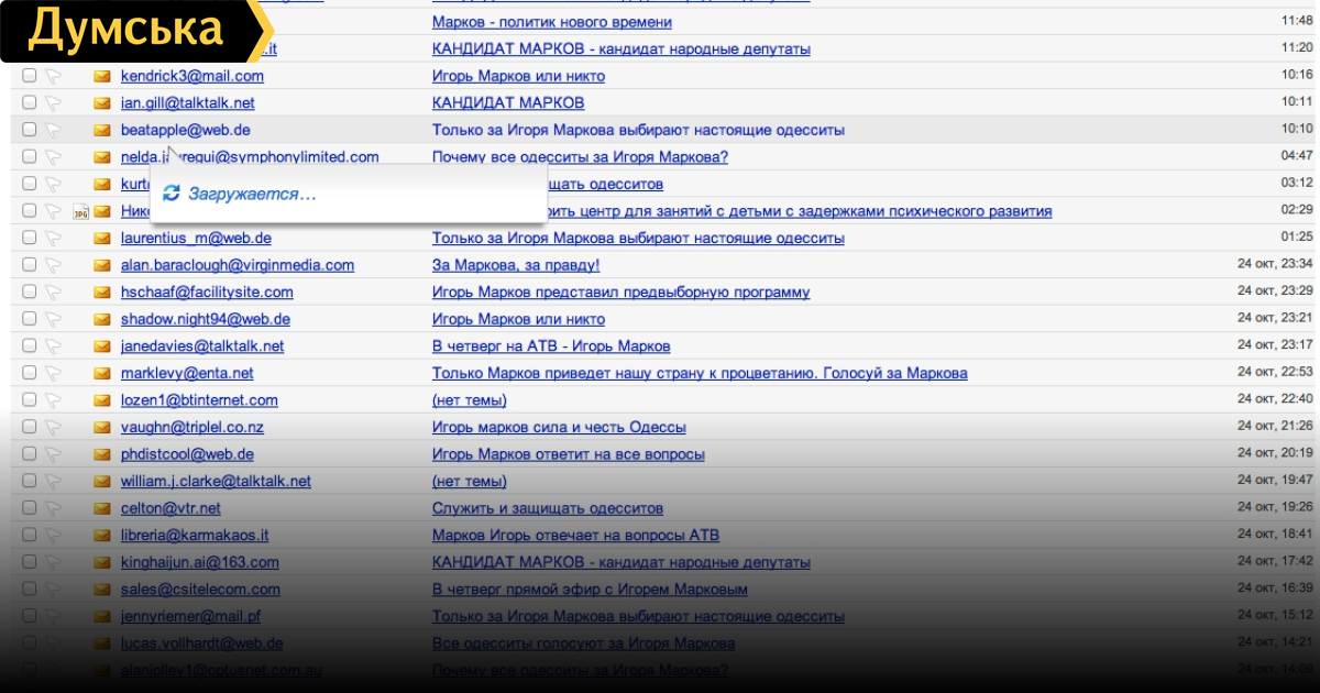 За несколько дней до выборов одесситы стали получать десятки писем, расхваливающих кандидата по 133 округу Игоря Маркова. В частности, авторы писем призывают голосовать за Маркова, сообщают о последних мероприятиях с участием кандидата, а также основные тезисы из его предвыборной программы.