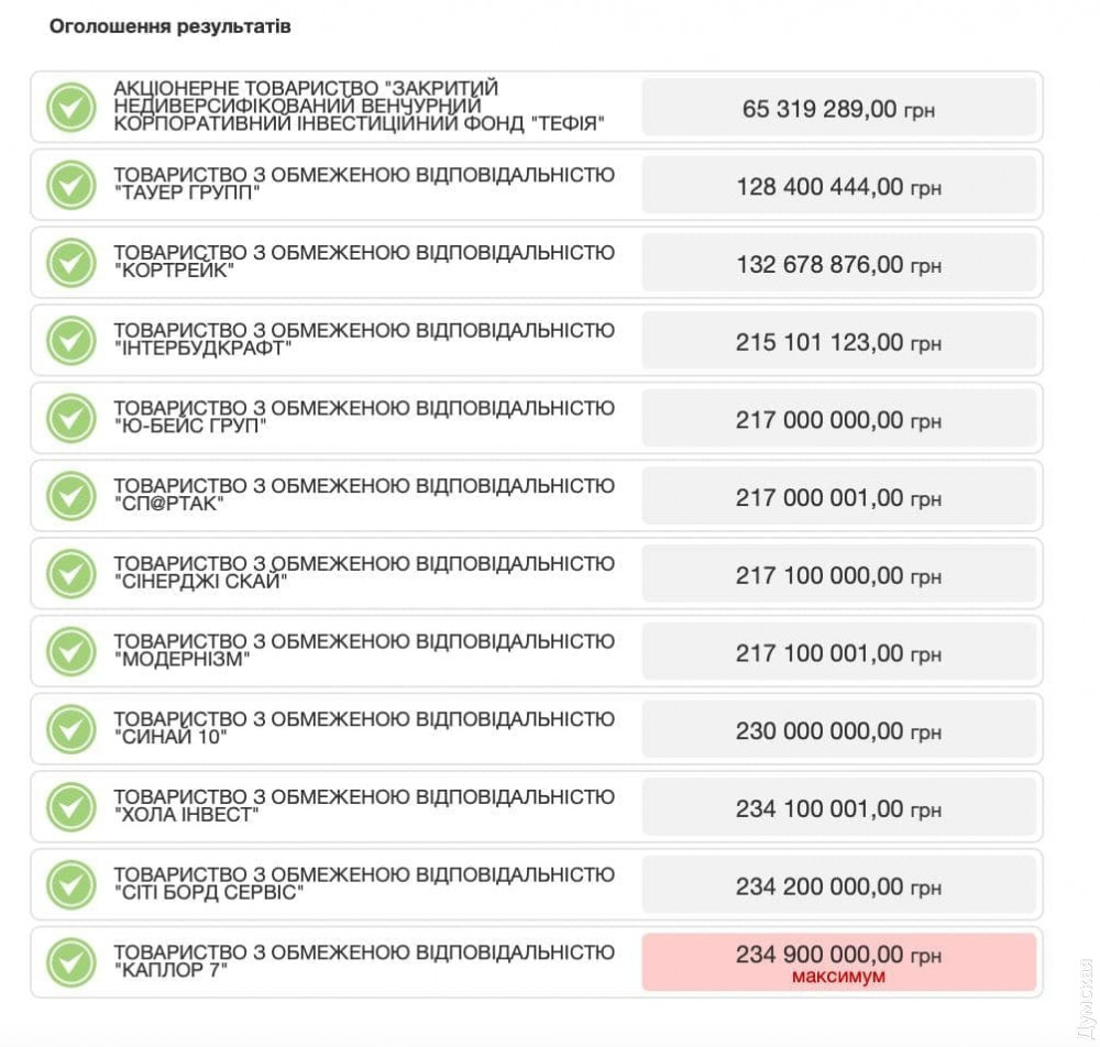 Аукцион по приватизации винзавода на Французском: победила фирма, связанная с бывшим зятем ЧерновецкогоАукцион по продаже имущества предприятия «Одессавинпром» провел сегодня Фонд госимущества. В торгах приняли участие 12 потенциальных инвесторов. В ходе аукциона цена лота выросла более чем в три с половиной раза, передает корреспондент «Думской». Победителем стало ООО «Каплор 7», которое предложило за 90 строений на Французском бульваре и в других районах Одессы 234,9 млн грн. Эта компания была учреждена в 2017 году, зарегистрирована в Одессе на Малой Арнаутской, 85. Директор и бенефициар с 3 сентября этого года — Наталья Голуб. Она связана с экс-депутатом Киевсовета и бывшим зятем экс-мэра столицы Леонидом Черновецким Вячеславом Супруненко, который занимается строительным бизнесом. На втором месте — ООО «Сити Борд Сервис», финальная ставка которого составила 234,2 миллиона. По информации «Думской», эта фирма аффилирована с холдингом ЗАРС — партнерами нынешнего арендатора винзавода, известного винодела Роберта Гулиева. Последний не скрывал своих планов приватизировать «Одессавинпром». Наш источник на предприятии выразил сомнение в честности проведенного аукциона. «Сегодняшним торгам предшествовали так называемые скрытые ставки: вчера участники сделали заявки, которые ранжировались по возрастанию. Предложивший наибольшую сумму получил право последнего хода. Это был «Каплор». ЗАРС явно рассчитывал, что остальные ставки будут меньше 200 млн грн, но, похоже, его предложение «слили» конкурентам, которые поставили больше и получили возможность перебивать каждый ход ЗАРСа, ставя минимальные суммы. Так они и выиграли. О планах этой фирмы ничего не известно, но, судя по тому, что это киевляне, что они смогли найти такие деньги, боюсь, участок ждет высотная застройка. ЗАРС тоже планировал реализовать на участке строительный проект, но довольно скромный, в глубине квартала», — отметил собеседник «Думской». Напомним, приватизация проводится на условии сохранения в течение трех лет основного профиля завода — производство вина и алкогольных напитков, а также обеспечение социальных гарантий сотрудников. Сейчас предприятие производит в год около десяти миллионов бутылок вина и бренди под торговыми марками «Французский бульвар», «Вина Гулиевых», KIEV Premium, «Француз». Еще одно обязательное условие — подписание охранного договора на фасадное здание со стороны Французского бульвара, которое является памятником архитектуры. Земельные участки под заводом находятся в коммунальной собственности и не являются предметом торгов. Условия их аренды, градостроительные условия и ограничения будет устанавливать городской совет. В течение десяти дней после проверки предприятия-победителя должен быть подписан договор купли-продажи. Если по какой-то причине «Каплор» передумает, право на приватизацию перейдет к ООО «Сити Борд Сервис», то есть ЗАРСу. Аукцион длился более двух часов, все желающие могли наблюдать ставки в прямом эфире. Комментировал торги руководитель регионального представительства ФГИ Александр Славский и директор ГП «Прозорро. Продажи» Алексей Соболев. СМЕРТЬ РОСІЙСЬКИМ ОКУПАНТАМ! Помітили помилку? Виділяйте слова з помилкою та натискайте control-enter Новини по цій темі: 26 червня 2025: Сумнівний подарунок: пам'ятку архітектури на П