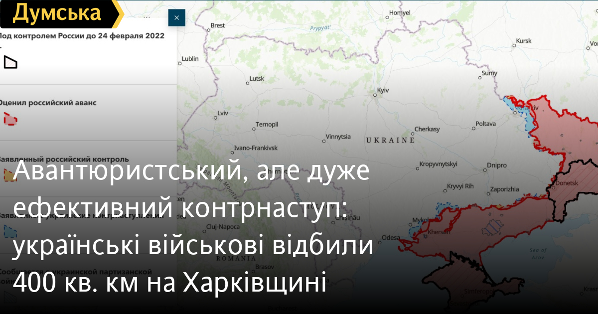 Аналітики припускають, що українські сили використали тактичну раптовість, щоб 7 вересня просунутися як мінімум на 20 км углиб території, що утримується росією, у східній частині Харківської області, відбивши приблизно 400 квадратних кілометрів території.