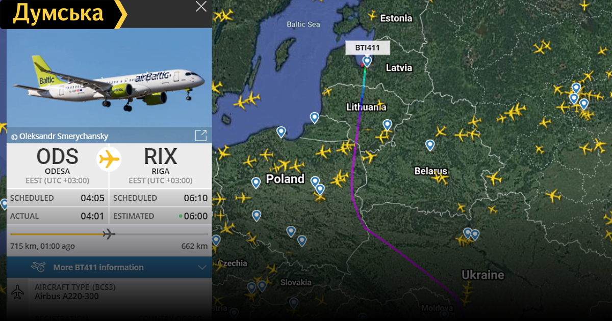 На этот раз Airbus A220 авиакомпании летел над Литвой, Польшей и далее зашел в воздушное пространство Украины над Волынью. Обратный рейс Одесса — Рига прошел по тому же маршруту.