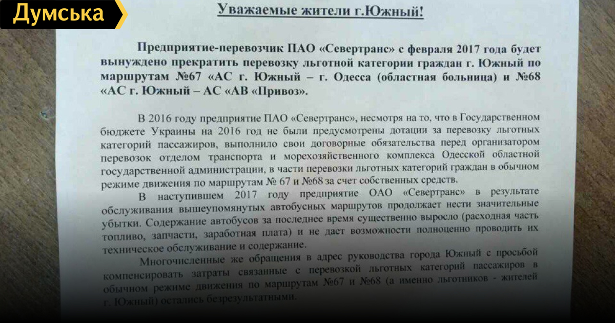 Компания «Севертранс» с февраля прекращает бесплатно обслуживать льготные категории пассажиров на маршрутах №67 и 68, связывающих Южный с Одессой (областной больницей и Привозом). Об этом говорится в объявлении перевозчика.